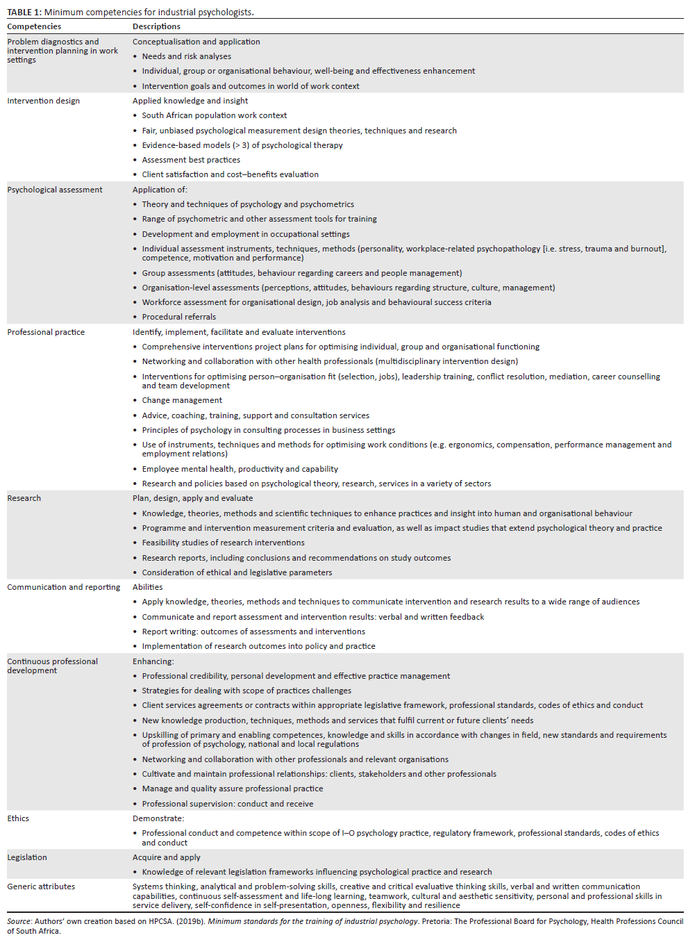 Scope of practice and minimum industrial psychologist competencies