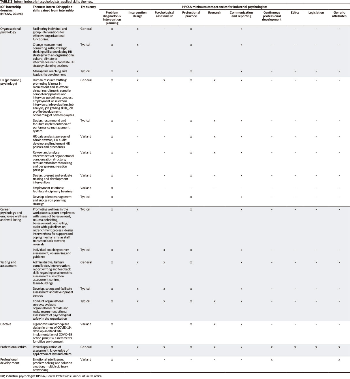 In Table 2, we compared the themes on applied skills gained from the internship programme with the HPCSA (2019b) minimum IOP competencies. Although the frequency of applied skills in the various internship domains varied for the participants, it is evident that the full range of HPCSA (2019b) IOP competencies were addressed in the internship programme. There also appeared to be a good balance between applied skills in assessment and interventions as required by HPCSA (2019a). Internship domain themes that emerged for all participants involved skills in facilitating individual and group interventions for effective organisational functioning (organisational psychology), the full spectrum of the human resource (personnel psychology) staffing domain, testing and assessment across the value chain and the application of ethics and legislative frameworks across all IOP domains.