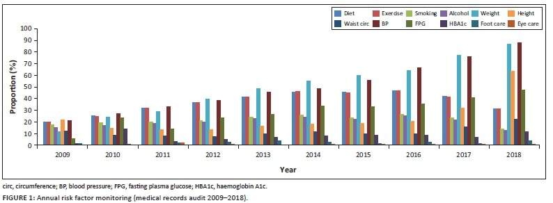 Of the 372 available medical records, 361 (97.0%) were eligible for review. Most patients (n = 351, 97.2%) were prescribed antihypertensive medication in 2009, increasing yearly to 358 (99.1%) by 2018. There were 56 (35.0%) T2D patients who were prescribed chronic diabetes medication and/or insulin in 2009, increasing yearly to 150 (94.3%) by 2018. Risk factor monitoring was best for weight (86.6%) and blood pressure (87.7%). Patient's annual weight monitoring increased from 11.9% in 2009 to 86.6% in 2018, and blood pressure monitoring increased from 21.2% in 2009 to 87.7% in 2018. Annual advice on foot care was 1.7% in 2010 compared to 3.9% in 2018 and eye screening 0.0% in 2009 compared to 2.0% in 2018) (Figure 1).