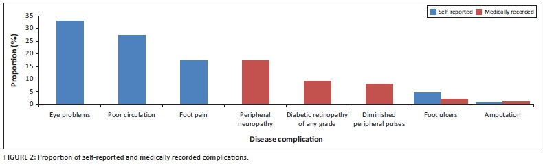 RESULTS: There were 379 patients in the survey, 372 (97.9%) had HTN whilst 159 (41.9%) had T2D and HTN; 361 medical records were reviewed. Blood pressure (87.7%) and weight (86.6%) were the best monitored risk factors. Foot care (0.0% - 3.9%) and eye screening (0.0% - 1.1%) were least monitored. Nearly 22.0% of patients reported one complication, whilst 9.2% reported ≥ 3 complications. Medically recorded complications ranged from 11.1% (1 complication) to 4.2% with ≥ 3 complications. The most common self-reported and medically recorded complications were eye problems (33%) and peripheral neuropathy (16.4%), respectively. Complication occurrence was positively associated with age and female gender and negatively associated with perceived illness control