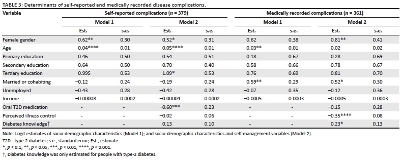 Occurrence of self-reported complications was positively associated with age and female gender (Table 3). Education level, marital status, employment status and income level showed no consistent association. Tertiary education, however, was positively associated with occurrence of self-reported complications. Perceived illness control was negatively associated with occurrence of medically recorded complications. Diabetes knowledge did not show an association with self-reported complications, but it showed a weak positive association with the occurrence of medically recorded complications.