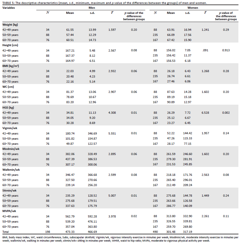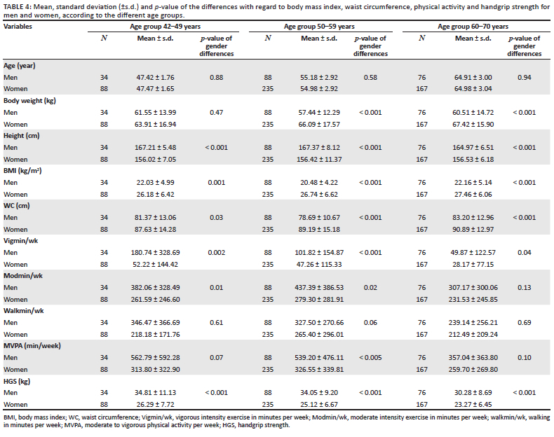 No significant difference was found in women's BMI for the three age groups (25 kg/m2) (p = 0.28), whilst a borderline significant difference (F = 2.932, p = 0.06) was found in men's BMI (Table 5). Significant differences (p < 0.05) were found in the HGS of both men and women. The 60-70 years' group performed poorer than the middle-age group. The men in the middle-age group participated significantly more in vigorous activities per week compared to the 60-70 years' group. A similar trend, although not significant (p > 0.05), was found in women.