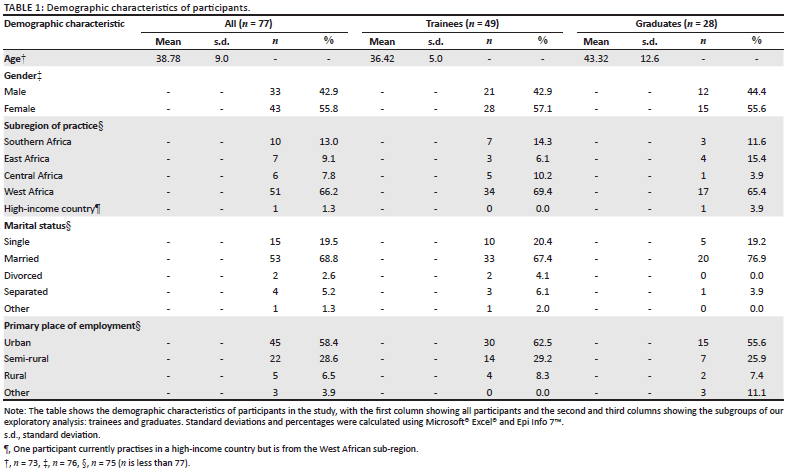 Amongst all participants (n = 77), the mean age was 37.9 years, 43 (55.8%) were female and 45 (58.4%) worked in an urban setting. The largest number of participants were from West Africa (52 participants, 67.5%). Trainees (n = 49) were younger, with a mean age 36.4 versus 43.3 amongst graduates (n = 28). The gender balance and regions of practice were similar between trainees and graduates. See Table 1 for collected demographics.