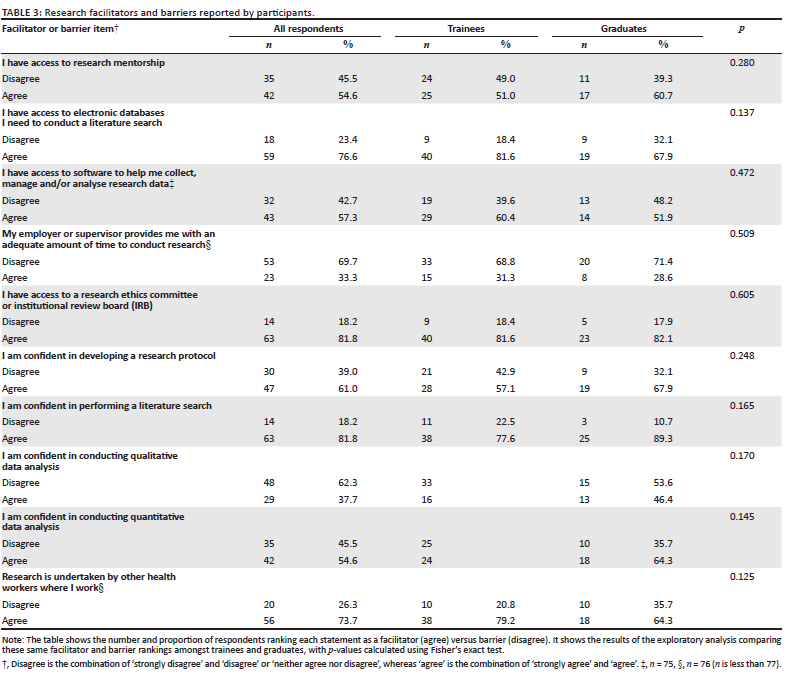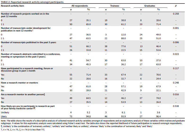 Descriptive analysis of demographic data was done using means, standard deviations, frequencies and proportions of data. The analysis was done using Microsoft® Excel® and Epi Info 7™.16 Missing values were few and were excluded via pairwise deletion.17 Participants' research activity were displayed to view patterns and then dichotomised as a means of summarising the data.18 Likert scale data for facilitators and barriers were also dichotomised by recoding the 'strongly agree' and 'agree' items as 'facilitator' and the 'neither agree or disagree', 'disagree' and 'strongly disagree' as 'barrier'. The researchers were interested in exploring if collected data suggested any differences in research activity or perceived facilitators and barriers between current trainees versus FP graduates. An exploratory bivariate analysis on dichotomised research activity and facilitator or barrier data was conducted to compare trainees and graduates in the sample.