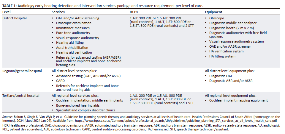 Early hearing detection and intervention is a four-component package that includes: (1) early detection through screening, (2) diagnostic assessment to diagnose the HL, (3) amplification through hearing aid fitting and (4) (re)habilitation therapy together with speech therapists (ST). Previous research has shown that EHDI helps maximise children with HL's access to sound and the hearing world,7 which is important for the development of communication abilities. Additionally, when intervention is provided in the first 6 months of life, children with HL can develop language in line with their normal-hearing peers.8 The prerequisite resources for the provision of EHDI per level of care, according to the Health Professions Council of South Africa (HPCSA) guidelines for planning speech therapy and audiology services,9 are outlined in Table 1.9 According to these HPCSA guidelines,9 as depicted in Table 1, all hospitals should have an audiology technician (AUT) to conduct the screening (EHDI) and implement intervention plans as planned by the audiologist. In addition to an AUT, an audiologist (AU) is also required to conduct diagnostic assessments, diagnose the HL and plan the treatment or management of HL, i.e. the selection and fitting of hearing aids and planning the aural rehabilitation. Additionally, ST are also required to provide aural rehabilitation with paediatrics (except hearing aid fitting and verification) and early communication intervention. Specific to equipment, the HPCSA guideline stipulates that hospitals and clinics should have an otoscope, screening otoacoustic emissions (OAE) and/or automated auditory brainstem response (AABR), diagnostic middle ear analyser with 1000 Hz probe tone, a diagnostic audiometric booth (at least 2 m × 2 m) and a diagnostic audiometer capable of performing visual response audiometry. In addition, hearing aids, fitting software and verification systems are also required to objectively verify hearing aid fittings.