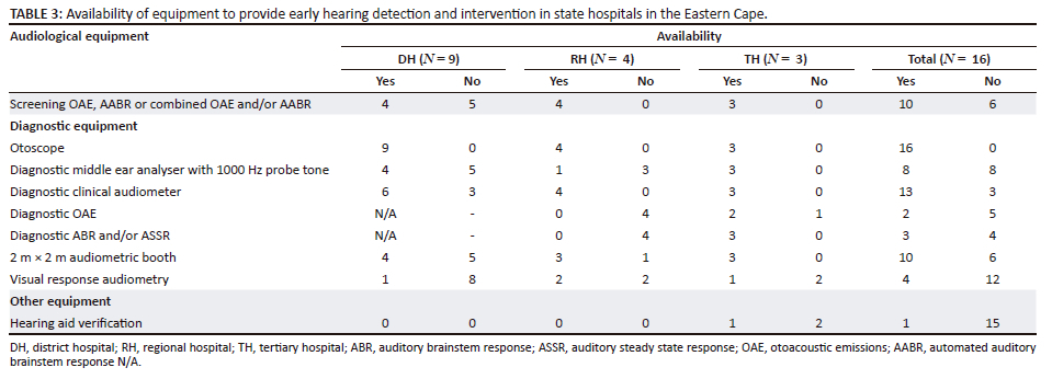 As far as the researchers know, this was the first study to document the availability of resources to provide EHDI in state hospitals in the EC province, South Africa. Hospitals depend on the availability of resources such as screening and diagnostic audiological equipment, human resources in the form of audiologists, finances and clinical protocols to provide EHDI services.14 Thus, a lack of any of these resources can impede the provision of EHDI. Findings from this study showed an uneven distribution of the essential resources for providing EHDI within the state hospitals in the EC Province.