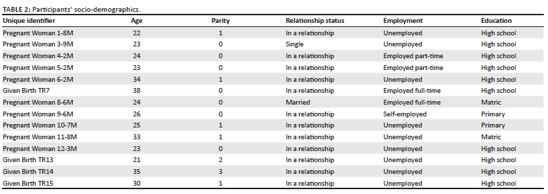 A total number of 14 participants agreed to participate in this study. When the data were collected, 10 women were pregnant, and four had recently given birth. Participants were between the ages of 21-40 years. The highest qualification obtained was high school education; most participants were unemployed. Marital status shows that most participants were not married but in relationships and cohabitating with their partners (Table 2). Parity data reflects seven participants were first-time mothers and the other seven had children before.