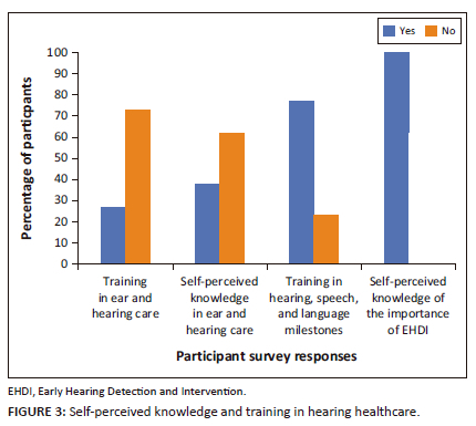 Of those who indicated they do not offer hearing screening with equipment at their facility, most of the participants (83%; 20/24) indicated that they had not received any training in hearing and communication milestones in babies and children, and the remaining 17% (4/24) had received the relevant training. Figure 3 provides a summary of the participants' self-perceived knowledge and training of ear and hearing care, and related developmental milestones in babies and children.