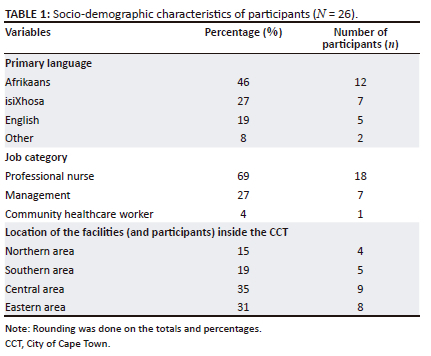 The survey link was sent to 55 CCT PHC clinics that provide mother and child healthcare services, and only 26 of the 55 participants (47%) agreed to participate in the study. Majority of the participants (18/26; 69%) were employed as professional nurses. Refer to Table 1 for a detailed description of the participants.