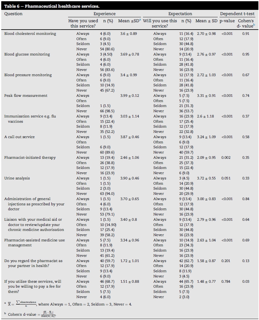 The healthcare-related experiences and expectations, as reported by the study population, are reflected in Table 6 and shows that there were statistically significant differences in most of the pharmacy healthcare-related needs. The only statistically significant association was their willingness to pay for healthcare services at the pharmacy (p = 0.201) and that they regard the pharmacist as their partner in health (p = 0.784). Cohen's d-value indicates practically significant associations between most of the healthcare services offered: Blood pressure monitoring (d = 0.67); Peak flow measurement (d = 0.74); immunisation services (d = 0.37); the need for a call-out service (d = 0.58); pharmacist-initiated therapy (d = 0.35); urine analysis (d = 0.33); liaison with other healthcare professionals (d = 0.64); medicine management (d = 0.69); the pharmacist as a partner in health (d = 0.13) and the participant being willing to pay for healthcare services (d = 0.03). This correlates with a study in Texas, USA (Xu, 2002), where elderly patients, using community pharmacy, showed a high rate of satisfaction with pharmaceutical services. In Australia (Peterson, Jackson, Hughes, Fitzmaurice, & Murphy, 2010) and in Oman (Jose, Al Shukili, & Jimmy, 2015), patients expected community pharmacy to offer healthcare services.