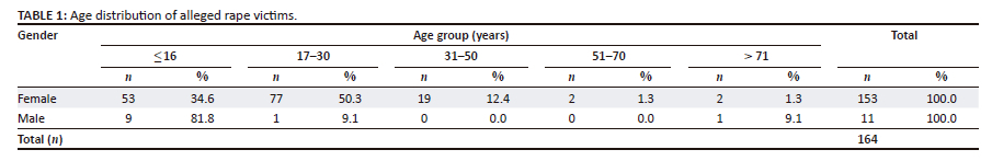 The majority of the alleged rape victims were female (153; 93.3%) with mean age (SD) of 21.6 years (11.3), while male victims accounted for only 6.7% (n = 11) of cases, with a mean age (SD) of 10.5 years (6.9). The highest incidence of alleged rape cases in male and female victims was seen in the age groups ≤ 16 years (n = 9; 81.8%) and 17-30 years (n = 77; 50.3%), respectively (Table 1). The races of these patients were deliberately not recorded in the case files. This was done to avoid racial profiling.