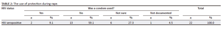 About half (n = 86, 52.4%) of the victims reported that the perpetrator did not use any form of protection (condom), 15.9% (n = 26) were unsure, while only 11.6% (n = 19) reported that a form of protection (condom) was used during the alleged act of rape. This information was not documented for 33 (20.1%) cases. It is interesting that the majority (n = 13, 59.1%) of those who reported to be HIV positive were raped without protection (Table 2).