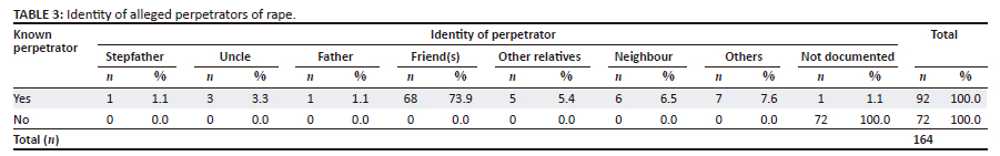 The findings in this study show a strong and significant association between the incidence of alleged rape and when it occurs, namely mostly on weekend nights, up to midnight. This finding corroborates that of Swart et al. (2000), who report that the incidence of rape in Johannesburg, South Africa, was found to dramatically increase from Fridays, with the highest incidence on Saturday, followed by Sundays (Swart et al. 2000). In addition, they report that most rapes reported in the Johannesburg area occurred between 18:01 and 00:00 (Swart et al. 2000). This suggests a link between the incidence of rape and increased social gatherings that often take place, sometimes up to midnight, on the weekend days in most parts of South Africa. Most rapes are reported to occur at social gatherings while people are consuming alcohol (Cole 2006). In South Africa, a person cannot legally consent to sex if they are intoxicated (South African Government 2007). In this study, only a small number of victims of rape reported having consumed alcoholic beverages. This is contradictory to the findings of Oshodi et al. in a Cape Town study, where 58% of the rape victims reported having used alcohol (Oshodi et al. 2020). This suggests that one can be a victim of sexual assault regardless of the level of alcohol intoxication. While the majority of the victims were mentally competent, about 5.5% (n = 9) were recorded to be mentally incompetent and may have been incapable of consenting to sexual acts. This corroborates findings from studies that report that individuals with mental retardation are increasingly becoming victims of sexual abuse, including rape, in South Africa (Calitz 2011). The ingrained reliance of such people on the caregiver authority figure, emotional and social insecurities, ignorance of sexuality and sexual abuse and a powerless position in society have been documented as some of the reasons why mentally incompetent individuals are especially prone to sexual abuse (Morano 2001). Because the vast majority of these individuals are often unable to testify in court, the majority of perpetrators tend to avoid arrest, because of lack of evidence (Kheswa 2014). However, Pillay and Sargent (2000) advocate that a non-intimidatory approach, characterised by developmentally sensitive interviewing and the use of an intermediary system can substantially increase the individual's level of confidence and enable them to relate the events in simple terms and give credible evidence in court (Pillay & Sargent 2000). It has been reported that primary care physicians (PCPs) have a potentially powerful role in preventing and documenting cases of sexual abuse of people who are affected by intellectual disabilities in their communities (Morano 2001). During clinical visits, PCPs must look out for signs of sexual abuse or sexual activity and must exhibit courage and report any irregularities (Morano 2001). In addition, PCPs should be aware that people who are mentally incompetent and who live in community group homes can be easy targets for abuse by caregivers or other members of the community as the majority of abusers are known to these individuals (Morano 2001).