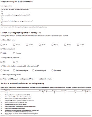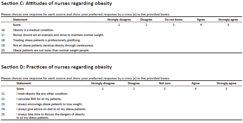 The data were gathered using a questionnaire with four sections. The participants' sociodemographic details, including age, sex, knowledge of body mass index (BMI), highest level of education and occupation, were covered in the first section. The knowledge, attitudes and practices of the nurses addressing obesity were assessed using statements with five Likert scale responses included in the other three parts. The questionnaire is attached as Supplementary File 1.