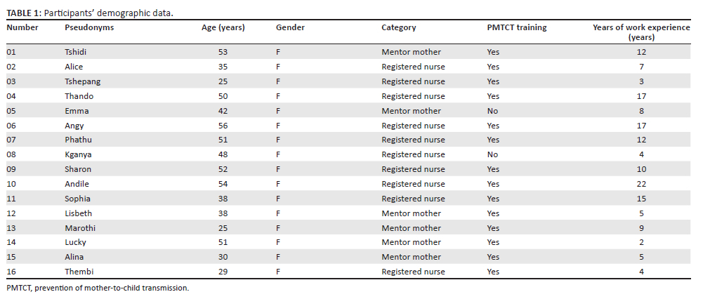 The population for this study was healthcare workers who were rendering the PMTCT services in the selected facilities during the COVID-19 lockdown. Among the healthcare workers, only nurses and lay counsellors (who were mentor mothers) were purposively selected for the study. The criteria for inclusion into the study were as follows: having worked for 6 months or more before COVID-19; having provided PMTCT services during the COVID-19 pandemic. The study excluded all healthcare providers who were not attending to PMTCT clients during COVID-19 lockdowns, those on leave during the data collection phase and those who refused to be audio-recorded. Sixteen healthcare providers constituted the sample of the study determined by data saturation.