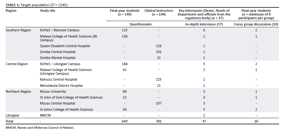 The target population comprised 1345 students and clinical instructors, 643 final-year nursing and midwifery students and 702 clinical instructors. This population was only from the sampled institutions. Nursing and midwifery students were recruited through a formal letter to the office of deans of students in their respective institutions, whereas clinical instructors were recruited through nursing administrators in their institutions. Ten focus group discussions (FGDs) were conducted with separate final-year students from the same population. The final-year students who participated in the questionnaire survey were requested to recuse themselves from the FGDs. Thirty-seven in-depth interviews were conducted with key informants. Table 1 details the study participants, who comprised final-year students, clinical instructors and key informants. The table also shows the data collection methods for each group of participants.