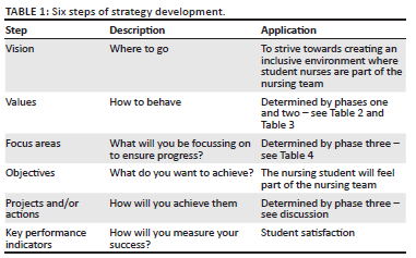 A 'strategy' can be defined as a process of selecting the most suitable action(s) to meet an objective (Cote 2020). In the context of this study, developing strategic actions that will contribute to the student nurses' experiences of feeling as part of the nursing team. The literature describes six steps that need to be taken into consideration (Butuner et al. 2019:97; Cote 2020), and the application of these steps is illustrated in Table 1.