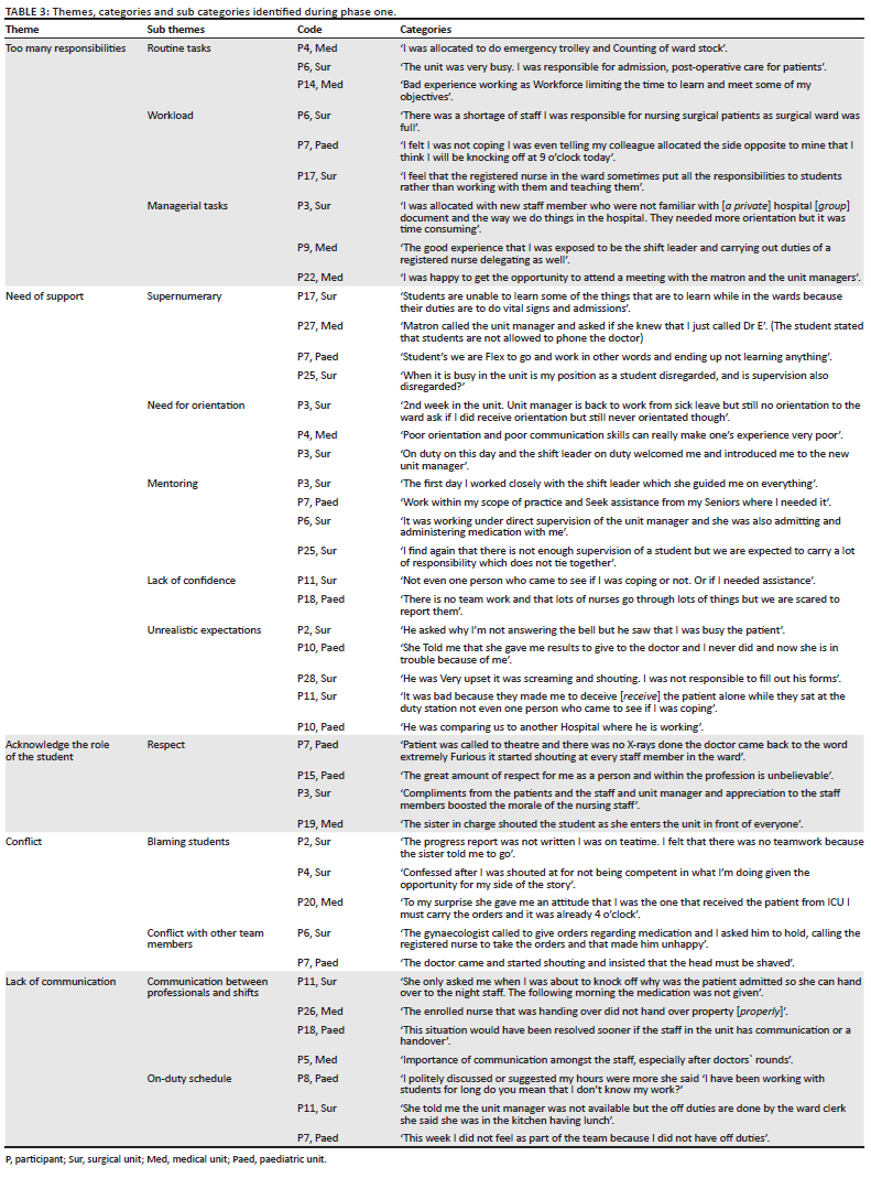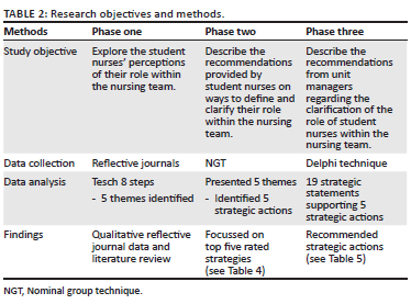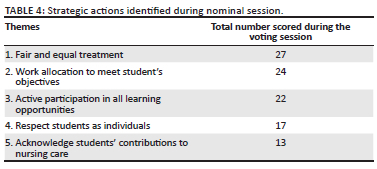 Data from phase one's reflective journals were analysed using Tesch's eight steps for qualitative data analysis (Creswell & Creswell 2018:271) (Table 2 and Figure 1). These findings were presented to participants in phase two to provide a background for the participants who took part in the NGT. The justification for providing a background presentation to guide the NGT stemmed from the fact that the students, despite their involvement in phase 1, were unaware of the findings from other participants. This presentation served to offer participants a comprehensive overview of the collected perspectives and experiences within the group. By doing so, it facilitated their ability to concentrate on essential aspects when formulating the strategy. The nominal group analysis, displayed in Table 3, revealed five top rated strategies. These strategies were used to draft strategic actions to facilitate the inclusion of student nurses in the nursing team for phase three.