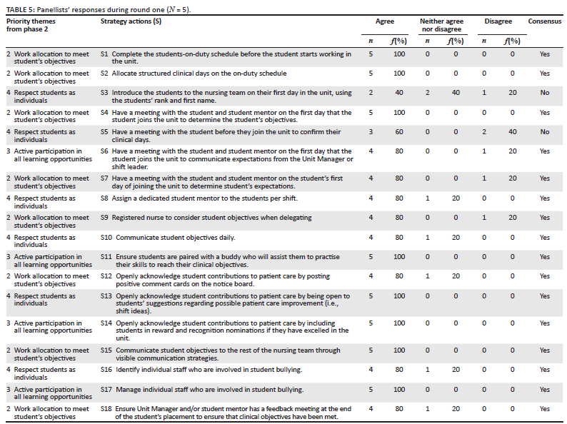 In phase three, participant responses received from SurveyMonkey software were analysed based on the five participants who responded. Consensus was determined if at least 80% of the participants agreed with the presented strategic actions. Strategic action statements that did not obtain 80% consensus were adapted and presented to the whole population again for a second round of consensus for all strategic action statements. Nine participants responded to the second round recruitment letter and e-Delphi. After round two, an 80% consensus was achieved, and strategic actions for student inclusion in nursing teams were accepted.