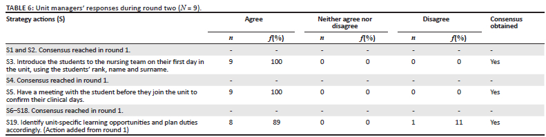 After receiving feedback from the panellists, a second round of data collection was needed, as consensus was not reached on all statements. The validation tool was adapted based on the suggestions for improvement received from the panellists. A recruitment letter providing access to the changed strategic action statements was sent to the total population for input during round two as displayed in Table 6. Suggestions for inclusion of strategic actions pertaining to setting clinical objectives for the unit, opportunities and planning on-duties, accordingly, were included in the second round (S19). Nine panellists responded to the recruitment letter for round 2.