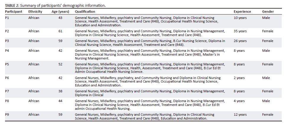 The study's findings emanated from purposively selected clinic managers' in-depth, individual interviews. These managers were from PHC clinics in the Ekurhuleni health district and had between 2 and 35 years' experience in their position. Five female participants between 38 and 61 years, and four male participants between 42 and 44 years, participated in the study. All the participants were Africans and held a Diploma in General Nursing, Midwifery, Psychiatry and Community Nursing and a post-basic Diploma in Clinical Nursing Science, Health Assessment, Treatment and Care (Regulation 48). Moreover, eight participants held post-basic B.Cur. Ed Admin Occupational Health degrees, and one participant had a Master's degree in Nursing Management. Table 2 illustrates the demographic information of the participants.