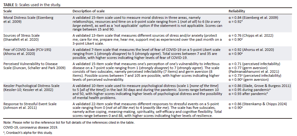 The shortage of nurses in South Africa has resulted in increased stress on nurses who already must cope with high workloads. Nursing is a high-stress profession, with increased vulnerability to disease (Gökkaya et al. 2022; Osagiator Ariyo et al. 2022; Padmanabhanunni & Pretorius 2023; Pasay-An 2020). This was especially experienced during coronavirus disease 2019 (COVID-19), with exposure to a contagious disease that was life-threatening (Van der Groot et al. 2021). In addition, nurses have to deal with daily ethical and moral dilemmas (Arafat, Tahir & Harisa 2023; Chersich et al. 2020; Lam & Hung 2013; Shanafelt, Ripp & Trockel 2020), as well as other work-related pressures (Wang et al. 2022), which can impact negatively on their mental health and well-being (Chipps & Jarvis 2021; Manzanares et al. 2021; Naidoo & Sibiya 2019).