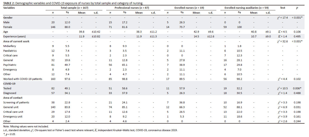 Nearly all the respondents worked with COVID-19 patients during the pandemic (n = 160/167 [97.6%]). Almost half of the respondents (n = 82, 49.1%) were tested for COVID-19, and over a third (n = 57, 34.1%) were diagnosed with COVID-19. More professional nurses were tested for COVID-19 than enrolled nurses and enrolled nursing auxiliaries (58.6% vs. 57.9% and 32.2%, respectively, χ2 = 10.5, p = 0.006). Most contact with COVID-19 patients were in general units (n = 140, 83.8%), followed by the screening of patients (n = 38, 22.8%). Only 12 (7.4%) respondents reported having contact with COVID-19 in paediatric units or other places (n = 12, 7.4%; Table 2).