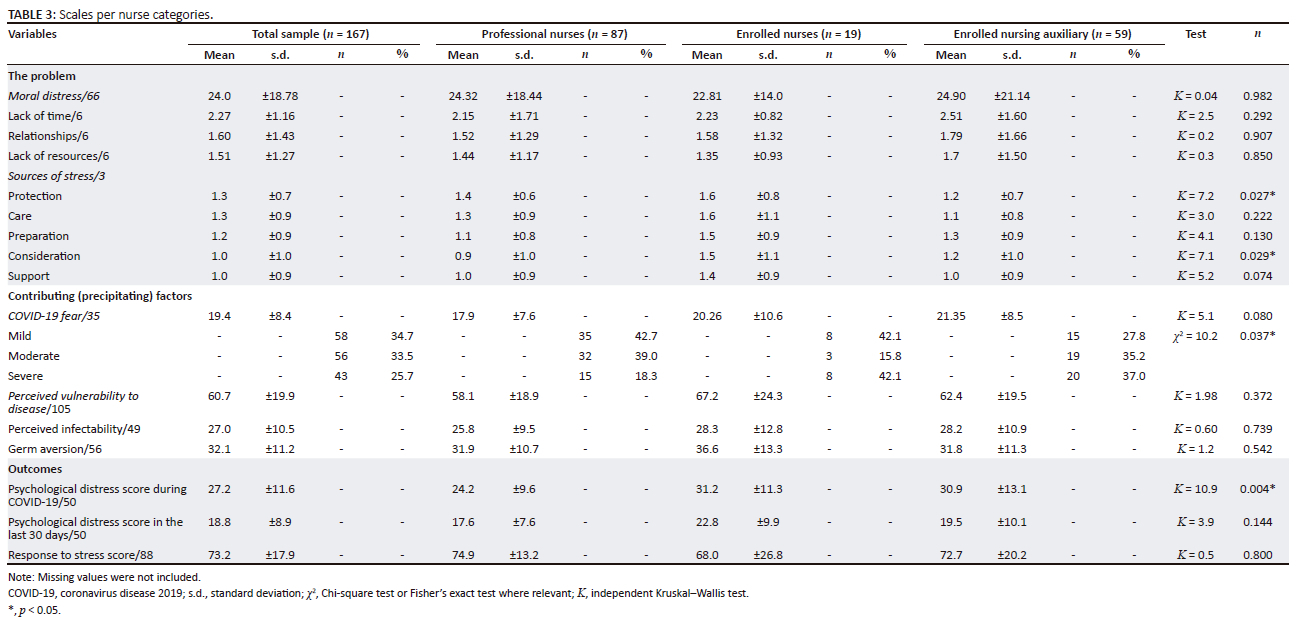 This is compounded with beliefs of perceived vulnerability, with our study finding moderate scores (60.7/105, ± 19.9). Coronavirus disease 2019 is a life-threatening disease, and although nurses in this sample reported mild-to-moderate (19.4/35, ± 8.2) levels of fear of contracting COVID-19, they may have felt a heightened sense of vulnerability to contract the disease considering that the disease is highly contagious. Several studies found that the COVID-19 pandemic impacted on nurses' perceived vulnerability to the disease (Gökkaya et al. 2022; Osagiator Ariyo et al. 2022; Padmanabhanunni & Pretorius 2023; Pasay-An 2020) and could result in heightened stress, anxiety, burnout and moral distress (Brysiewicz & Chipps 2022; Manzanares et al. 2021; Riedel et al. 2022; Sun et al. 2020; Udwadia & Raju 2020). Nurses' sense of vulnerability may further have been exacerbated by realities of workload and time constraints, limited access to personal protective equipment (PPE), access to timely information, and fears of infecting others or family members at home. In the current sample, nurses reported higher levels of stress related to stressors of protection (1.3, ± 0.7) and care (1.3, ± 0.9), with professional nurses having higher stress scores for protection (1.6 vs. 1.4 vs. 1.2, K = 7.2, p = 0.027) and consideration (1.5 vs. 1.2 vs. 0.9, K = 7.1, p = 0.029) compared to enrolled nurses and enrolled nursing auxiliaries.