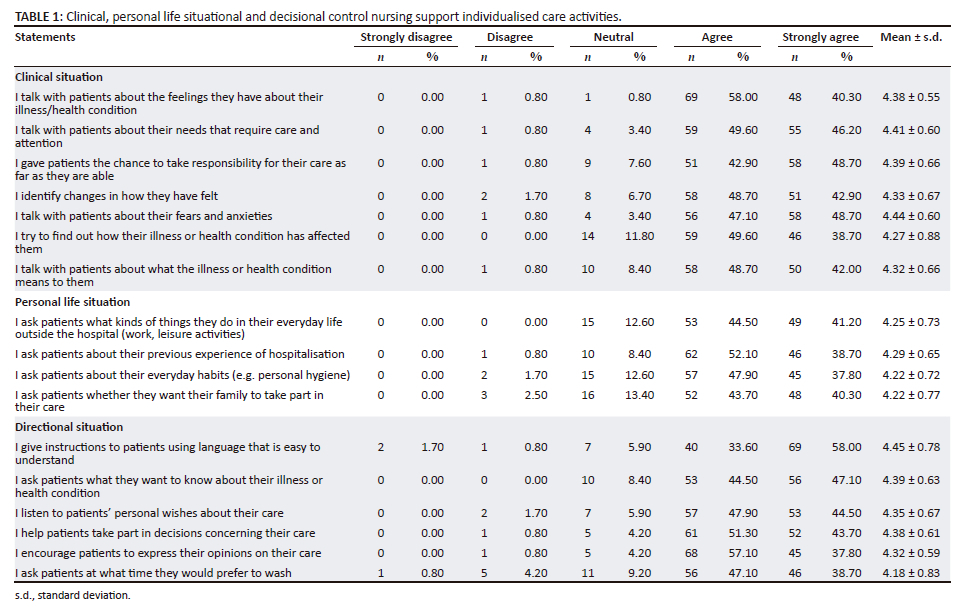 The second subscale has four items measuring personal life situation, including life situation in general and daily activities, habits or preferences, cultural background or traditions, family involvement and earlier experiences of hospitalisation. The third subscale consists of six items that pertain to decisional control over care. These items include knowledge about illness and treatment, the ability to make choices and consider alternatives, decision-making skills, and the ability to express personal views, opinions, wishes, or make proposals. The minimum score for ICS-A-Nurse is 17, and the maximum is 85. Higher scores of the ICS indicate more nurse-supported individualised patient care, while lower scores signify low individualised patient care support. The ICS-A internal consistency reliability scale had a strong alpha reliability score of 0.94 (Suhonen, Leino-Kilpi & Välimäki 2005). This study achieved the internal consistency of the questionnaire through a pilot study of five critical care nurses, which was not part of the actual data analysis.