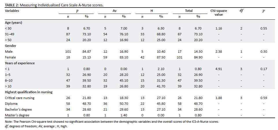METHODS: This cross-sectional study examined 119 conveniently selected critical care nurses from five units treating critically ill adult patients in a central tertiary care hospital in eThekwini district, KwaZulu-Natal, South Africa. Personified patient care was measured using the Individualised Care Scale (ICS).