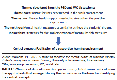 The findings revealed that participants found their involvement in patients' care to be rewarding. Radiation therapy students felt valued within the radiation therapy team and shared that patients often remembered them long after treatment. Radiation therapy lecturers emphasised the importance of providing student support to ensure positive clinical experiences, particularly through regular debriefing sessions and access to professional counselling. Radiation therapy students expressed a strong desire for a nurturing learning environment that supports their professional growth. They highlighted the need for structured clinical training across departments, regular debriefing, expert counselling and workplace readiness sessions. Both students and lecturers also pointed to the importance of mentorship, role modelling, planned debriefings and training in advanced technology. Overall, it became clear that creating a supportive learning environment is essential for helping RT students reach their full potential and maintain good mental health throughout their academic training. Based on this, the central concept identified in the study was 'facilitation of a supportive learning environment' (see Figure 1).