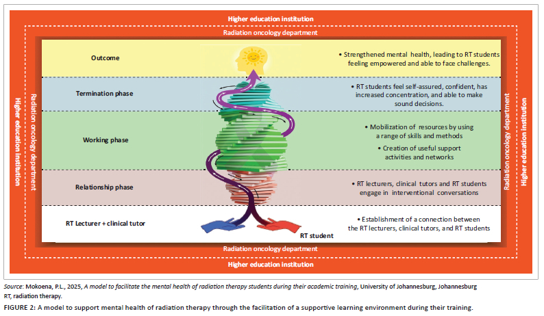 The outcome is the establishment of a supportive learning environment for RT students throughout their academic training, which is crucial for enhancing their mental health. An optimal mental health outcome for RT students is characterised by a sense of well-being in their thoughts, feelings and behaviours. They are equipped to manage the stresses associated with working in a radiation oncology department and to engage positively with patients, lecturers and their support network. Furthermore, these students engage in self-care practices that foster self-awareness and self-regulation. They recognise their strengths, positively influence patients' lives, adapt to change, make challenging decisions and effectively manage their emotions. If needed, RT lecturers and clinical tutors provide ongoing support by adhering to key phases of the process. Ultimately, this process bolsters the mental health of RT students by cultivating resilience and adaptability as they navigate academic challenges.