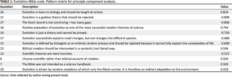The PCA revealed four major components with eigenvalues exceeding 1, but for reasons of simplicity it was decided to extract only two major components. The two-component solution explained 32% of the variance, with Component 1 contributing 21% and Component 2 contributing 11% to the total variance. Oblimin rotation was performed and the rotated solution revealed that 25 out of the 30 items in the questionnaire loaded strongly on one of these two components: 12 items loaded on Component 1, coinciding largely with questions pertaining to evolution, whilst 13 items loaded on Component 2 and these largely (but not exclusively) coincided with questions about science and faith. Component 1 was therefore named the 'Evolution-Bible scale' and Component 2 the 'Science-faith scale'. For the purpose of this article only Component 1 (Evolution-Bible scale) will be discussed, whilst Component 2 (Science-faith scale) will be discussed separately in a future article.