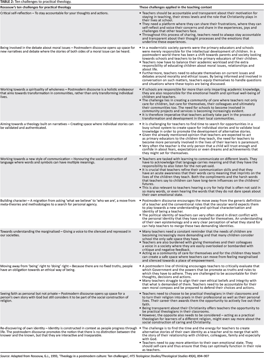 A postfoundational approach to practical theology opens up a line of thinking where the progress that practical theology has made in resolving these challenges can provide teachers, and the greater field of education, with tools to address their own challenges. The postmodern approach to thinking further reminds me that we can never reach a place of equilibrium where we do not have any challenges facing practical theology and teaching as individual fields or in the interface between these two academic disciplines. Table 2 therefore critically reflects on the initial ten challenges set by Rossouw in the current context of the merger between the worlds of teaching and practical theology in South Africa. The table offers a bird's eye view of the individual challenges that will be deconstructed and conceptualised in greater detail throughout the rest of this article.