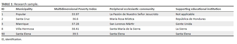 In Colombia, there are several standards for measuring poverty and extreme poverty, such as the Gini Index, the Human Development Index and the Multidimensional Poverty Index. The latter allows one to identify the poorest municipalities located in the peripheral area. In relation to the peripheral ecclesiastic communities of Medellín, we are considering the parochial communities with the highest Multidimensional Poverty Index, that is, the communities that have been systematically impoverished in the city (Alcaldía de Medellín 2017).