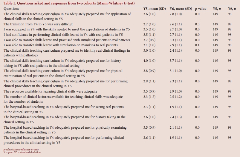 Because the ordinal data were not normally distributed, the non-parametric Mann-Whitney U-test was used to compare the responses of the two cohorts for each question to test for significance (Table 1). The difference between the two groups was statistically significant for 14 of the 16 questions (p<0.05; 95% CI). The only 2 questions that did not have a statistically significant difference were the 'difficulty in the transition to fifth year from fourth year' and the 'ability to transfer skills learnt on manikins to real-life patients'. The mean for both groups for these 2 questions was <3, showing that both groups had a more negative perception for these questions.