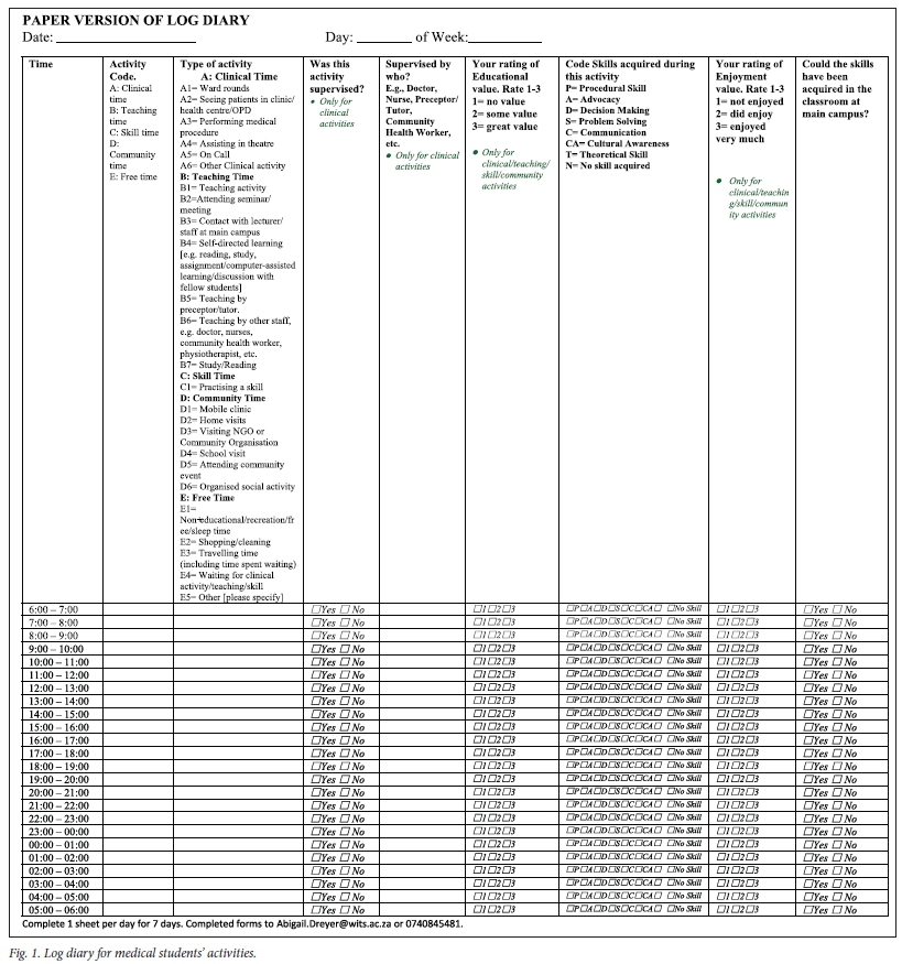 A = clinical time; B = teaching time; C = skill time; D = community time and E = free time or activities of daily living. For each of these activity codes, a further coded breakdown was recorded in the log diary. The students also had to record whether the clinical activity was supervised, and who did the supervision. In the log diary, students were requested to indicate their perceptions of the educational value of the activity, the skills acquired during the activity, a rating of activity enjoyment, and whether the skills could have been acquired in the classroom at the main campus.