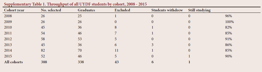 A total of 172 medical students (6-year qualification) were supported over the 8 years, representing the largest discipline, with the smallest number of six students selected in 2009 and the largest number of 43 selected in 2014. Eight students in the 2014 cohort were excluded by UYDF - at the time of the study four were still registered, and one had completed, increasing the throughput to 84%. The 2014 cohort had the lowest throughput of 81%, while the 2008 and 2009 cohorts achieved 100% throughput from a total of 16 students. One student in the 2015 cohort is still studying after a break in her studies due to ill health.