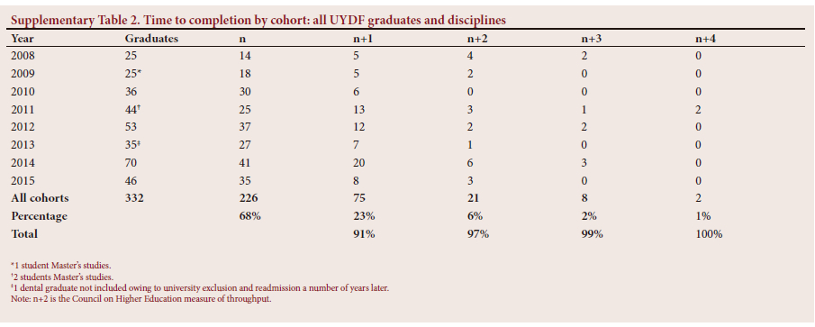 In the present study, across all disciplines, 91% of UYDF students had completed after 1 additional year (Table 4). If the students had been solely dependent on NSFAS financial support, 9% of UYDF students would have been left without funding in the new NSFAS dispensation of providing support for 1 additional year (n+1). Of greater concern is that according to CHE data,[18] only 59% of students studying for 4-year health science degrees had completed in the minimum time plus 1 year, meaning that significant numbers of students would have lost their NSFAS funding before completing their degrees, which may result in their never completing, owing to financial challenges.[12]