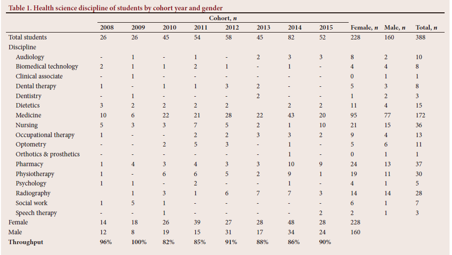 Table 1 provides details of all UYDF students supported from 2008 to 2015, with the first 2 years having the smallest cohorts of fewer than 30 students each. Female students were in the majority in all cohorts (except in 2012) and in all health science disciplines (except optometry), and constituted 59% of student numbers.