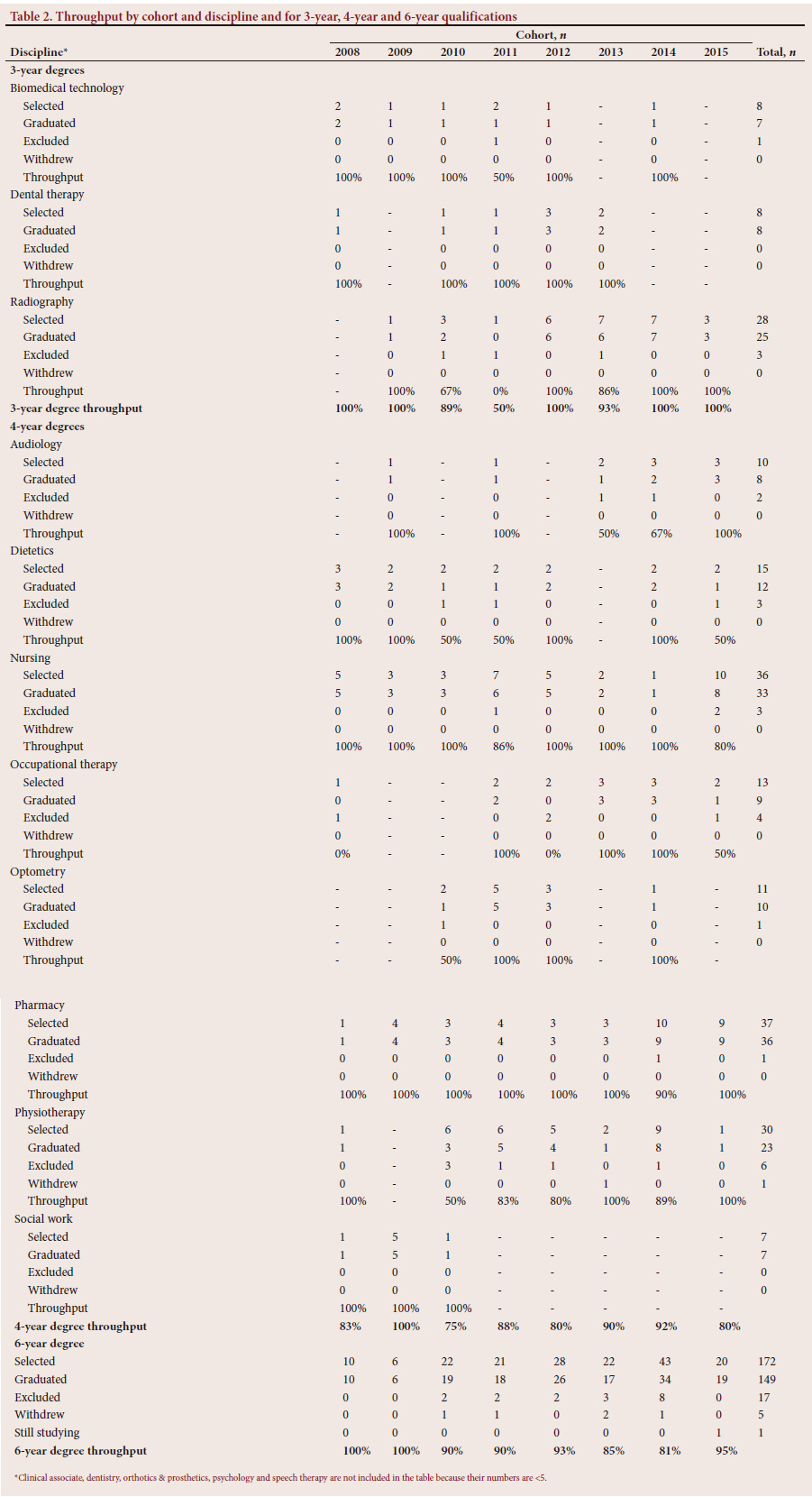 METHODS. A total of 388 student records from the 2008 - 2015 cohorts, covering 17 different health science disciplines, were analysed, and throughput rates and time to completion for the different cohorts and health science disciplines were calculated. Throughput rates and time to completion were also calculated for 3-year, 4-year and 6-year qualifications.