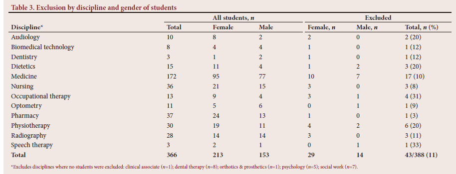 Across all disciplines except dietetics, more female students (n=29) were excluded than male students (n=14), and across six disciplines only female students were excluded (Table 3). For five disciplines, clinical associate (n=1), dental therapy (n=8), orthotics and prosthetics (n=1), psychology (n=5) and social work (n=7), no students were excluded. Pharmacy had the lowest exclusion rate of 3%, followed by optometry (9%) and medicine (10%). Occupational therapy students had the highest exclusion rate of 31%.