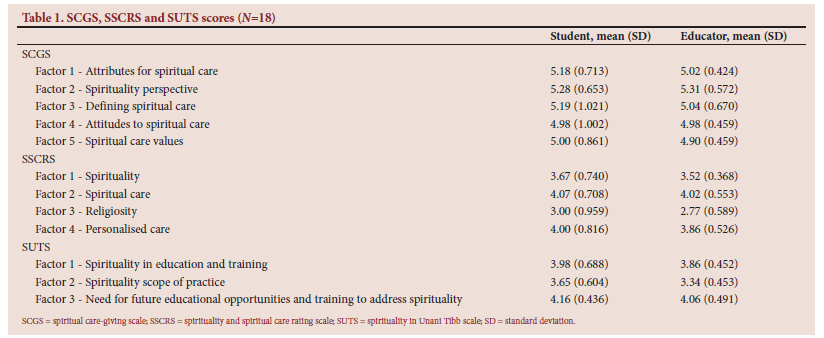 A total of eight (80%) Unani Tibb students and 10 (100%) Unani Tibb educators participated in the quantitative study. The mean values for perceptions of spirituality and spiritual care were computed for each factor on the SCGS. The mean scores regarding spiritual care practice were computed for each factor on the SSCRS. The mean scores relating to spirituality in Unani Tibb education were computed for each factor on the SUTS. The SCGS, SSCRS and SUTS scores are presented in Table 1.