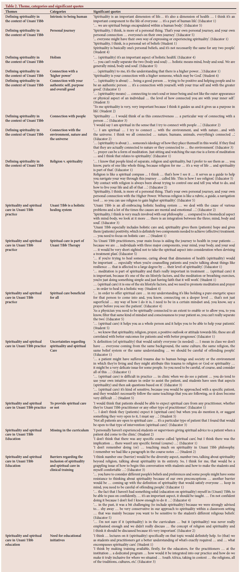 The most significant finding of this mixed-method study was the heightened level of spiritual awareness of this cohort of Unani Tibb students and educators, despite the lack of spirituality and spiritual care content in education and practice in SA. All participants emphasised the holistic nature of Unani Tibb and the importance of spirituality and spiritual care in the lives of students, educators, patients and practitioners. They strongly advocated for the inclusion and integration of spirituality and spiritual care content into the Unani Tibb curriculum.