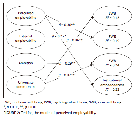 Perceived internal employability significantly impacted both psychological and social well-being among FA students. Perceived internal employability - defined as confidence in one's career readiness and perceived alignment with labour market expectations - appears to serve as a key psychological resource. Perceived internal employability includes factors such as prioritisation of academic work, awareness of job opportunities, belief in relevant skills and optimism about employment outcomes. According to Keyes' (2024) well-being conceptualisation, psychological and social well-being are critical indicators of individuals' overall functioning. In this context, psychological well-being may be enhanced by a student's sense of purpose, perceived competence and forward-looking confidence in their future career trajectory (Bowman, 2010). When students believe their efforts are meaningful and likely to result in employment, they may experience higher levels of self-acceptance, personal growth and autonomy - dimensions central to psychological functioning (Keyes, 2002, 2024). Research by Petruzziello et al. (2023) and Schettino et al. (2022) confirmed that perceived employability impacts students' well-being.
