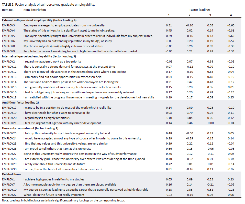 Exploratory factor analyses with PCA extraction were carried out on the 30 items of the SPGE. Goodness-of-fit indices showed acceptable fit with a KMO value = 0.75, χ2 = 1 237.739 (degrees of freedom [df] = 435, p < 0.001). Nine factors had eigenvalues above one, with an accumulative variance of 69% explained. Eigenvalues were 7.991 (27%), 2.461 (8%), 2.201 (7%), 1.790 (6%), 1.554 (5%), 1.331 (4%), 1.230 (4%), 1.177 (4%) and 1.096 (4%). The scree plot showed one strong component and three additional differentiated components. Principal axis factor analysis with a direct oblimin rotation was used to analyse the factor structure. Four factors that explained 48% of the total variance were extracted: external self-perceived graduate employability (ESPGE), internal self-perceived graduate employability (ISPGE), ambition and UC. Factor loadings were as follows: ESPGE: six items, λ = 0.30 to 0.69, mean = 0.50; ISPGE: eight items, λ = 0.33 to 0.70, mean = 0.52; ambition: four items, λ = 0.30 to 0.84, mean = 0.57; and UC: eight items, λ = 0.29 to 0.81, mean = 0.55.