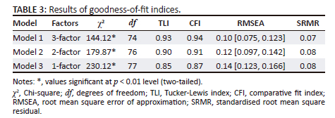 Model 3: The one-factor model comprised flourishing (14 items: emotional, psychological and social well-being) with item loadings (λ = 0.36 to 0.82, mean = 0.59). The fit statistics were χ2 = 230.12 (df = 77, p < 0.001); RMSEA = 0.14 [0.123, 0.166], p < 0.000; CFI = 0.87; TLI = 0.85; SRMR = 0.08. The model that presented the best fit to the data was Model 1 because it had the lowest RMSEA, Chi-square statistic, and highest TLI and CFI values of the competing models. Table 3 shows the goodness-of-fit indices for the different models.