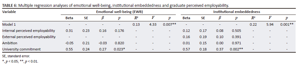 Table 6 shows that emotional well-being is predicted by employability (F = 4.33, p < 0.007, R2 = 0.13). The standardised regression coefficient of UC (β = 0.27, p = 0.023) is statistically significant. Finally, embeddedness is predicted by one dimension of employability (F = 5.94, p < 0.001, R2 = 0.22). The standardised regression coefficient of UC (β = 0.37) is statistically significant (p = 0.002).