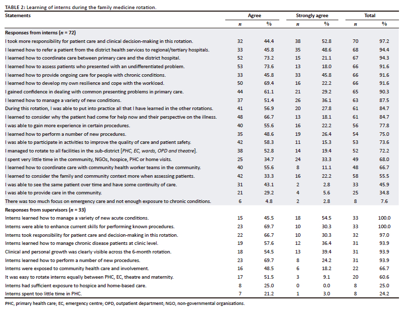 RESULTS: Questionnaires were completed by 72 interns (response rate 21%) and 36 supervisors (response rate 90%), across 10 training programmes. Interns felt more independent (97.2%), confident (90.3%) and resilient (91.6%). They learnt to manage undifferentiated and chronic conditions (91.6%), to refer patients (94.3%) and conduct procedures (77.8%). Most interns were not exposed to community-based services (68.0%) and continuity of care (54.1%). Supervision was mostly adequate during the day (79.1%) and afterhours (80.6%). Many interns reported no structured teaching programme (41.7% - 55.6%). Most supervision was from medical officers and registrars. Supervisors saw interns as valuable members of the clinical team (100.0%), who required extra support and administration (42.5%). The majority of interns (75.0%) and supervisors (72.7%) thought the rotation was the right length and the best preparation for community service (67.6%
