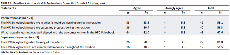 Table 3 reports on use of the HPCSA logbook and the proportion of respondents that agreed with the various statements. The supervisors mostly felt that the logbook did guide the training of the interns (81.8%); however, around half (51.5%) felt that it was not timeously completed throughout the rotation. While many interns reported that the logbook guided them in their learning (59.1%) and helped assess progress (56.3%), over 40% of interns did not feel this way.